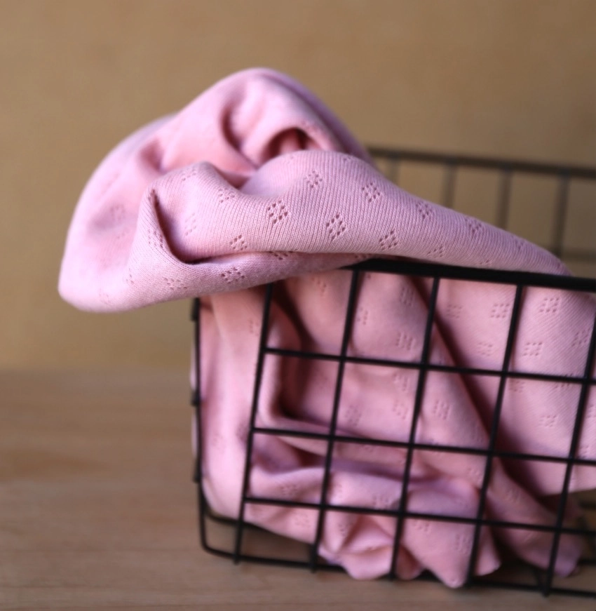Ta piękna, miękka dzianina z klasycznym, małym motywem diamentowym jest idealna na delikatne topy, sukienki, ubrania niemowlęce i akcesoria - koce, otulacze i inne.