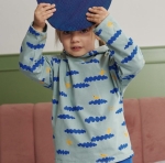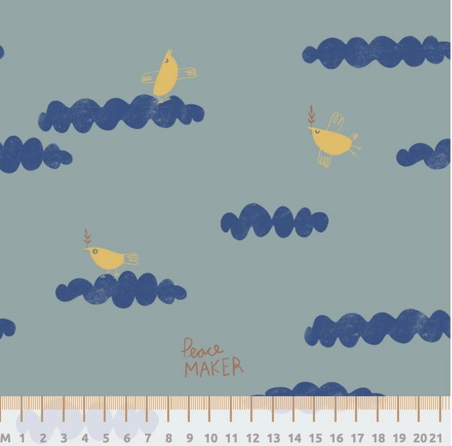 Dzianina Jersey z nadrukiem w niebieskie chmurki i żółte ptaszki na zielonym tle. Jersey idealny do szycia wygodnych ubrań, takich jak sukienki, koszulki i piżamy dla całej rodziny.