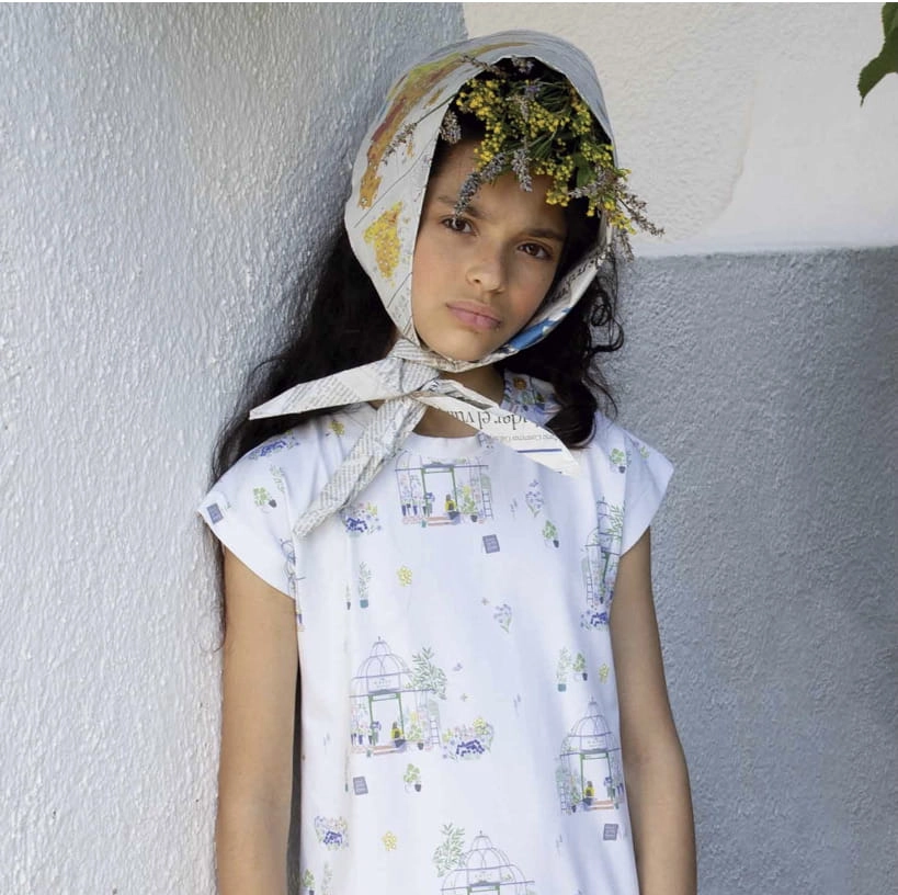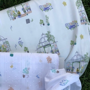 Tkanina typu dżersej z bardzo delikatną ilustracją pięknej kwiaciarni i kwiaciarni na zielonym tle w kolorze złamanej bieli.