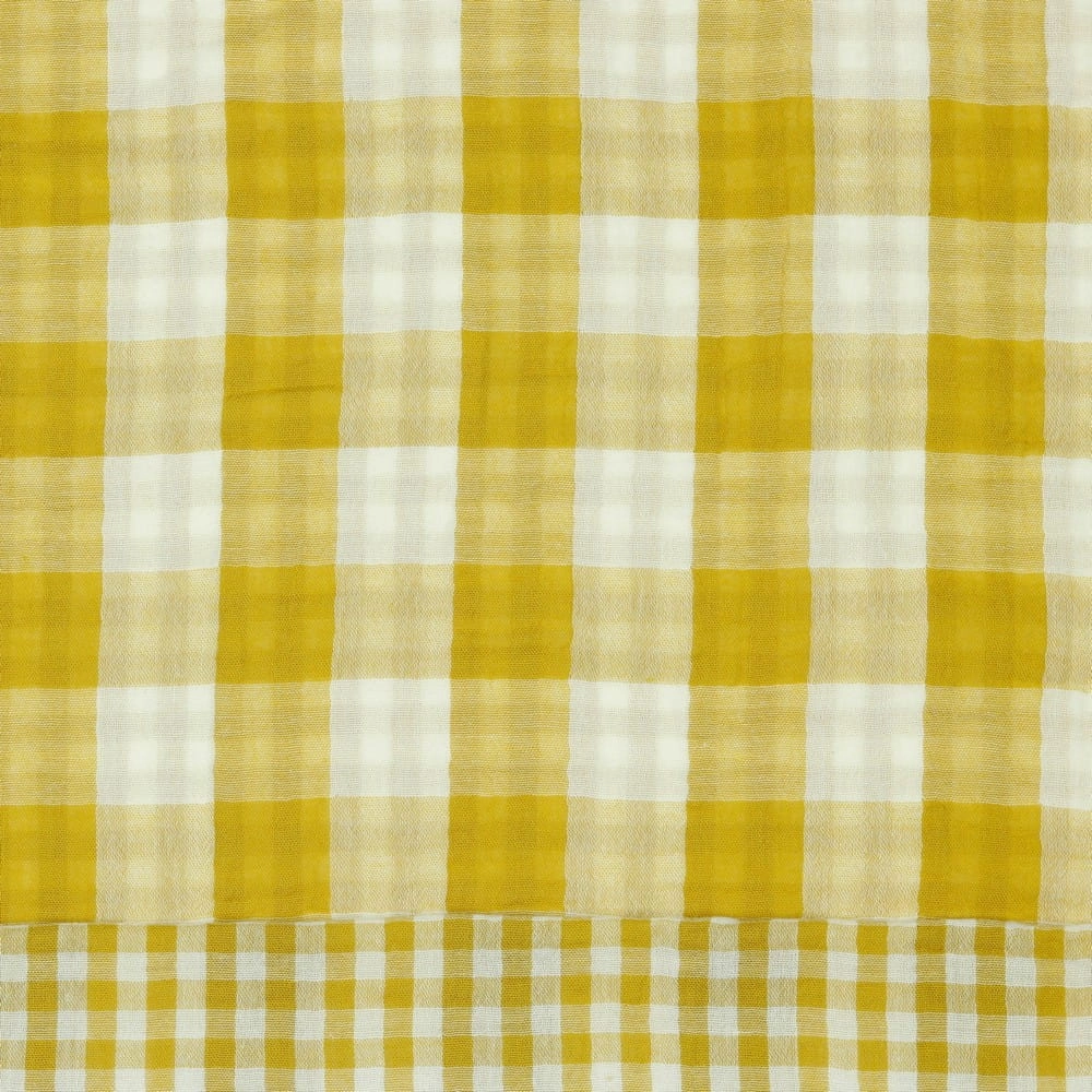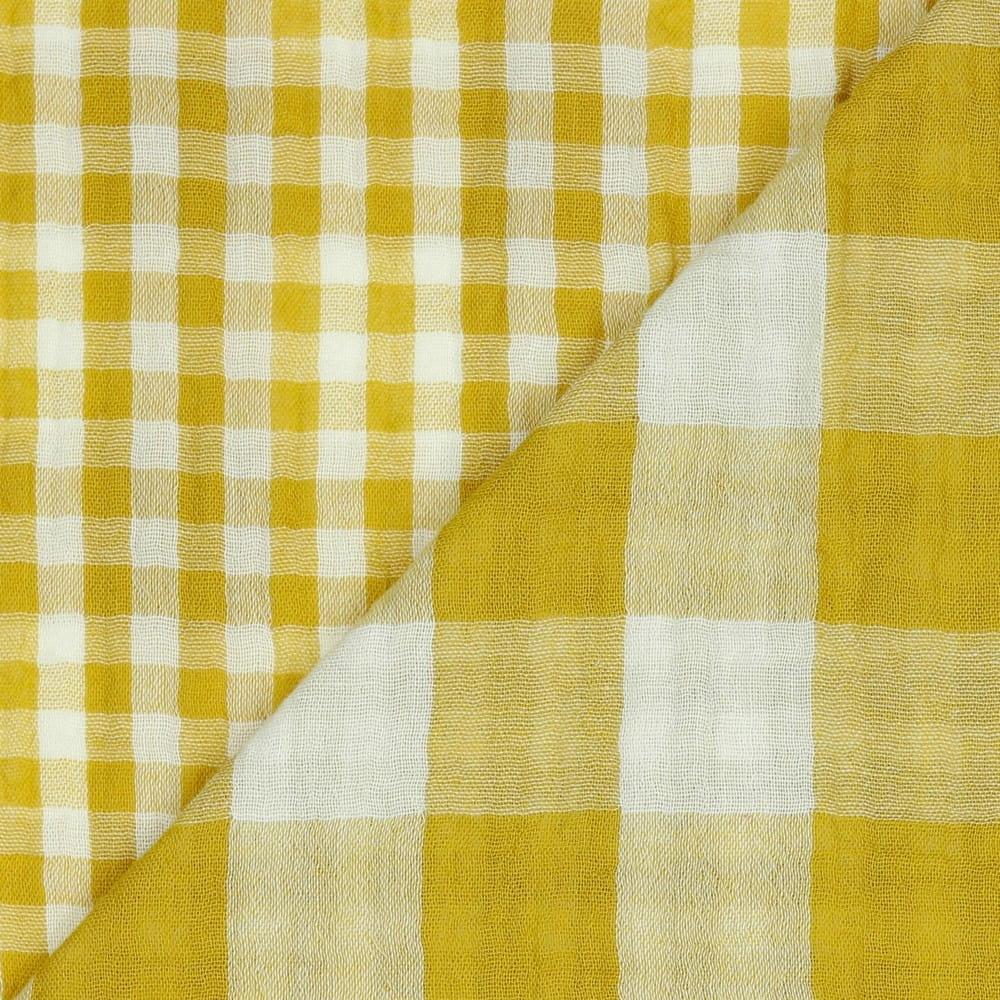 Dwa wzory w jednej tkaninie! Odkryj miękki muślin w kratę vichy w kolorze ochry, który z każdej strony wygląda inaczej. 100% bawełna z certyfikatem Oeko-Tex.