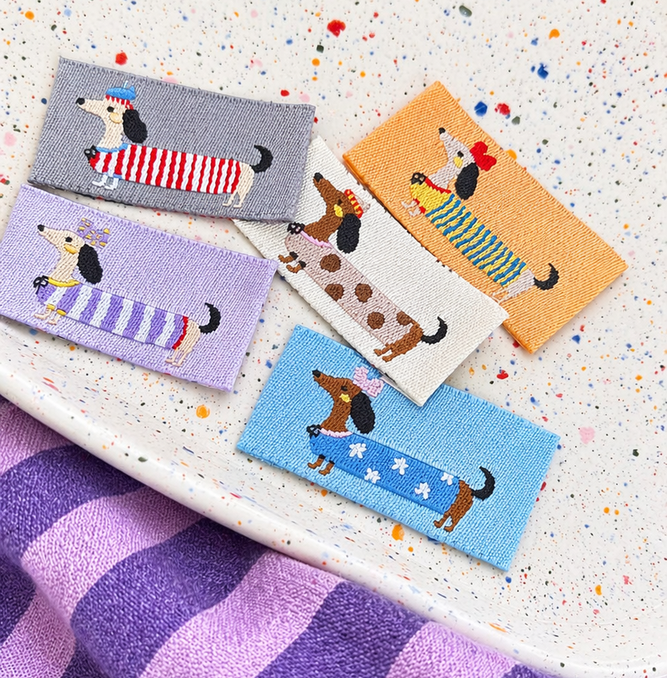 Zestaw uroczych wszywek z kolorowymi jamnikami.