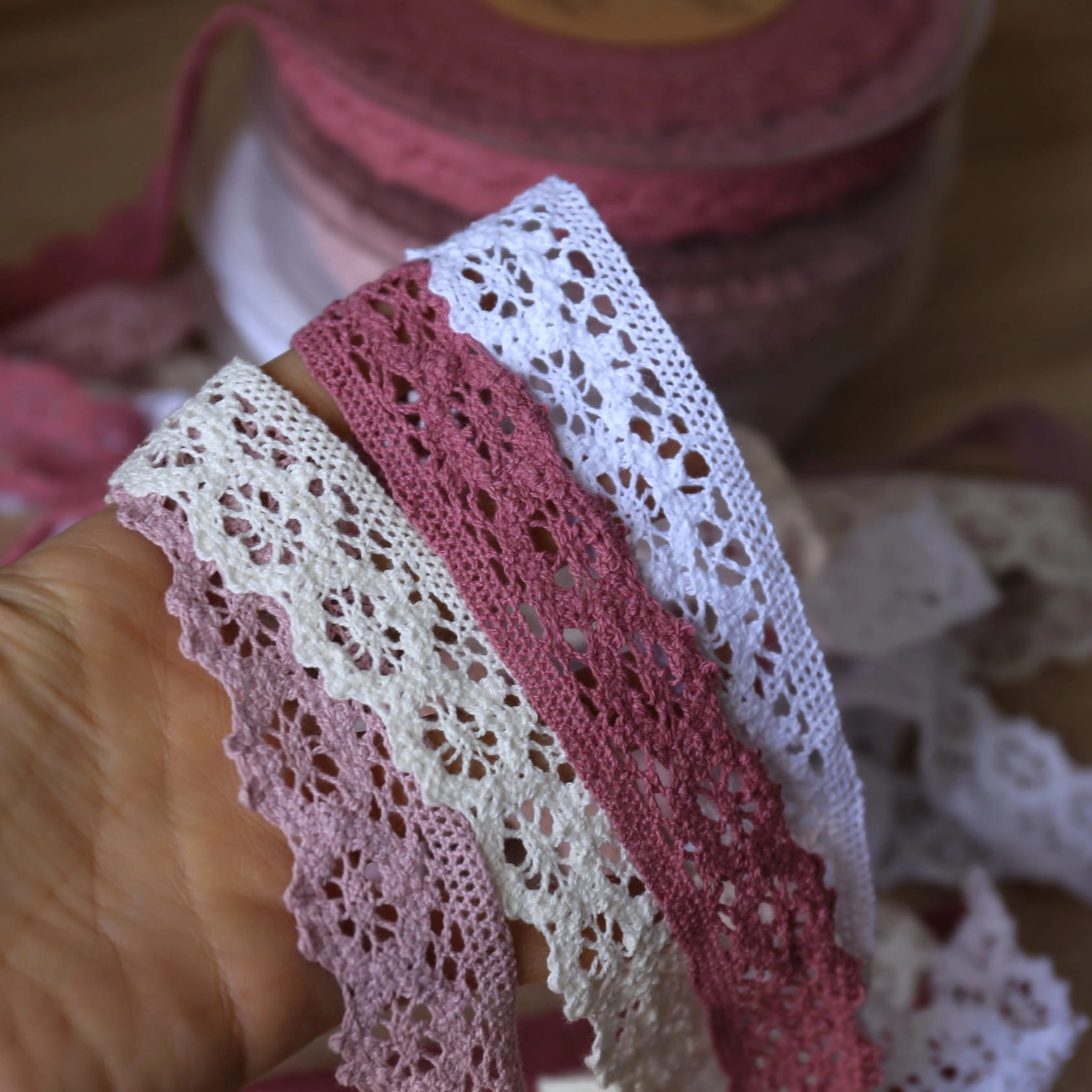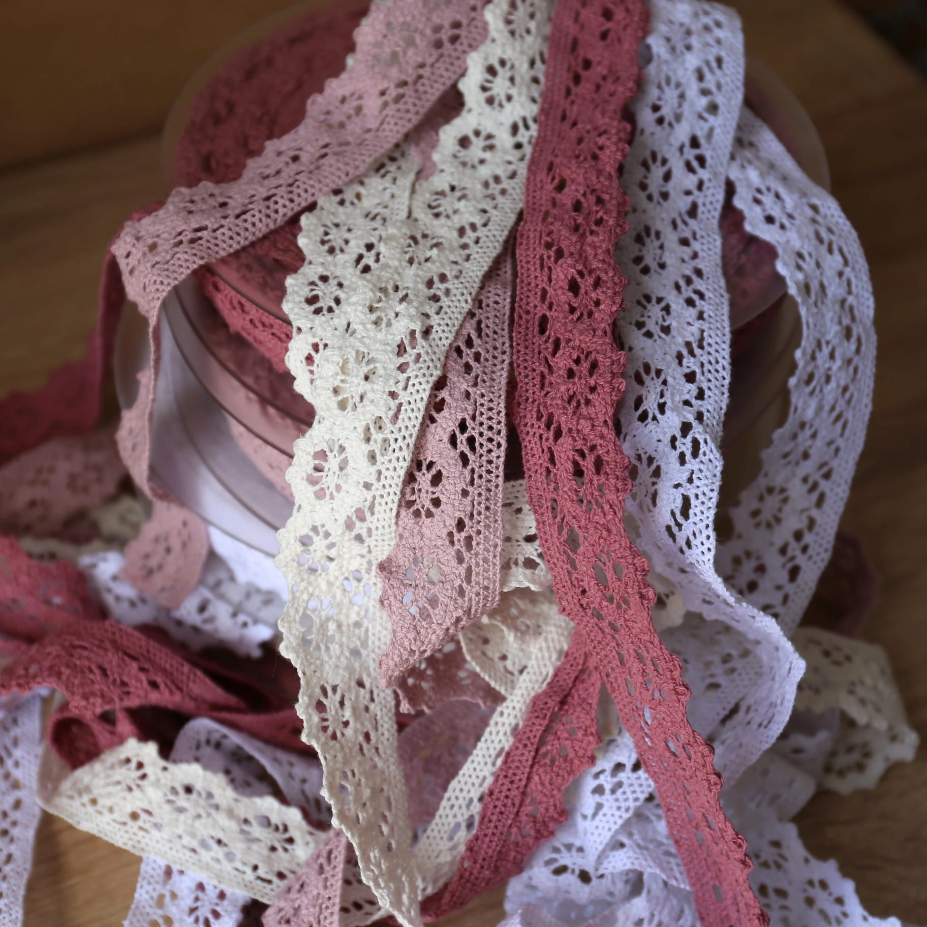 Śliczna bawełniana koronkowa taśma w kolorze brązowym. Świetnie nadaje się do wykańczania obrusów, sukienek, bielizny.