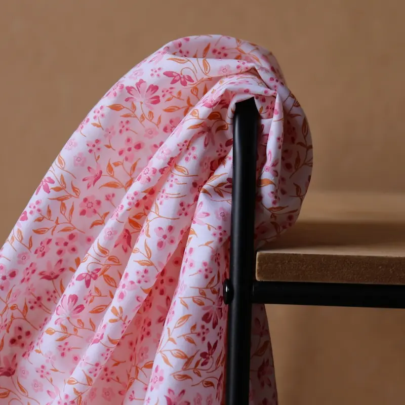 Wprowadź powiew romantyzmu do swoich projektów dzięki różowej popelinie bawełnianej Poppy Fabrics. Tkanina ta wyróżnia się gęstym, regularnym wzorem typu "łączka", gdzie drobne kwiatuszki w odcieniach różu harmonijnie łączą się z listkami w kolorze ciepłego brązu. To wzór, który nigdy nie wychodzi z mody, nadając projektom lekkości i świeżości.