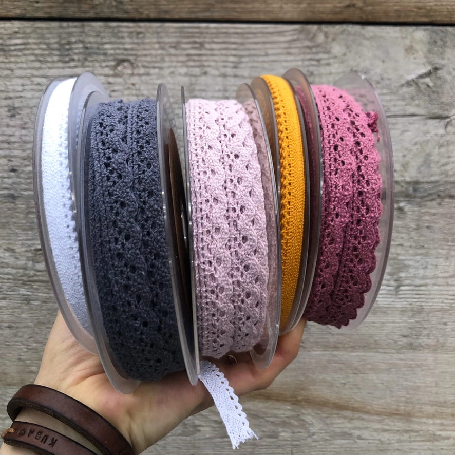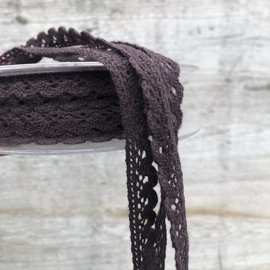 Śliczna bawełnina koronkowa taśma w kolorze brązowym. Świetnie nadaje się do wykańczania obrusów, sukienek, bielizny.