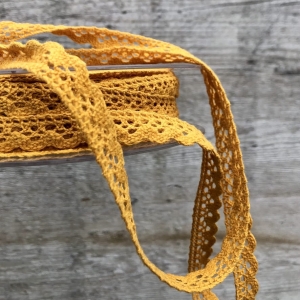 Śliczna bawełnina koronkowa taśma w kolorze ochrowym. Świetnie nadaje się do wykańczania obrusów, sukienek, bielizny.