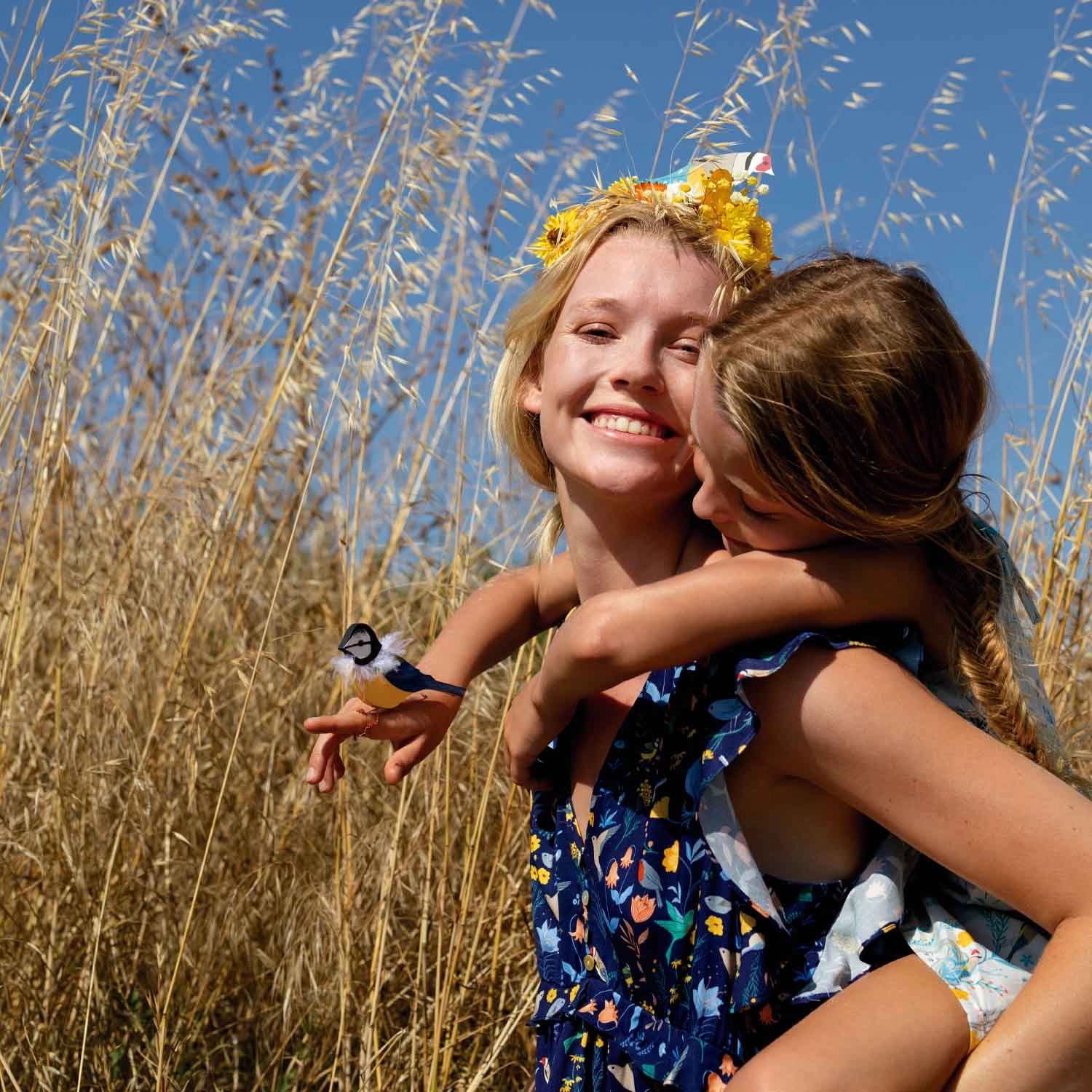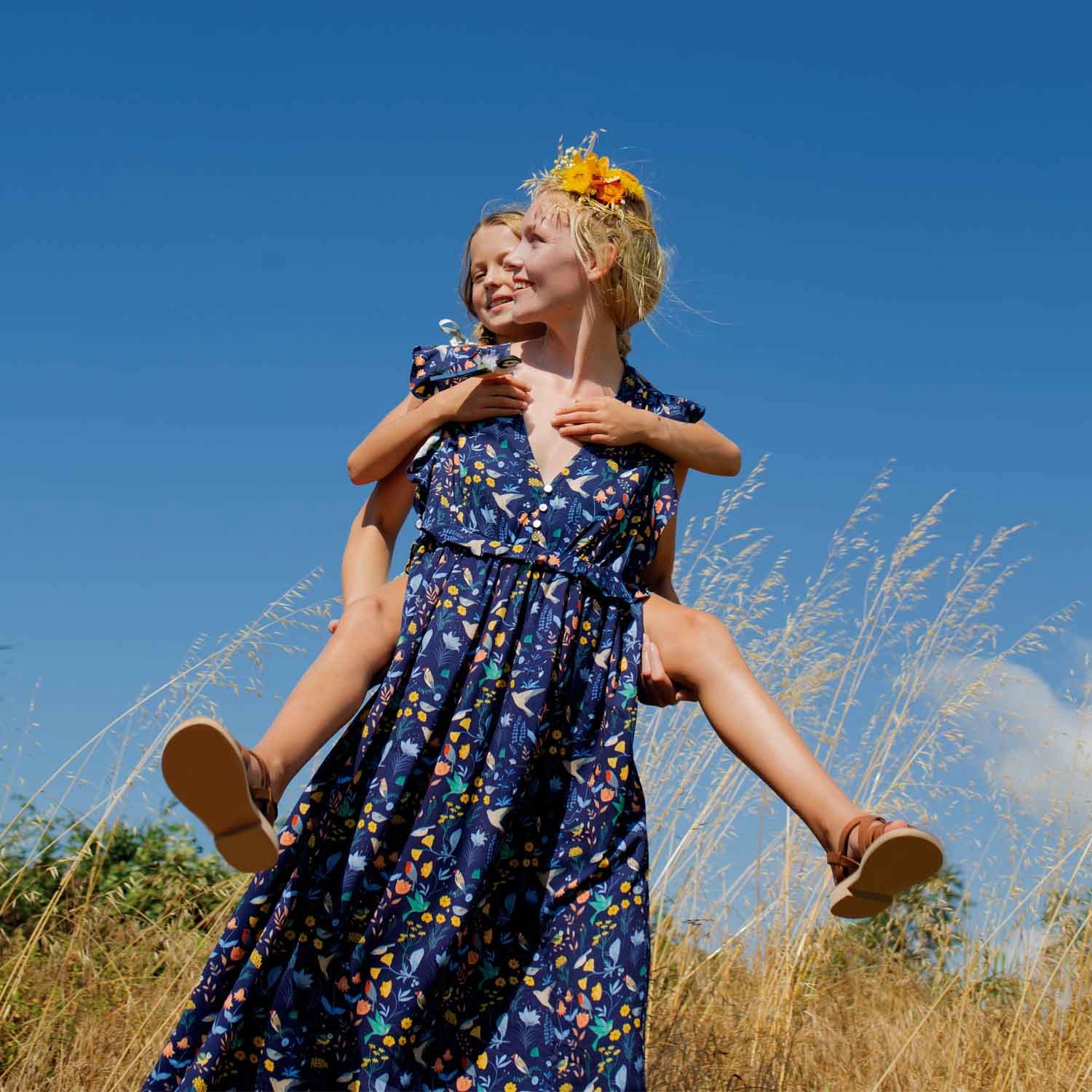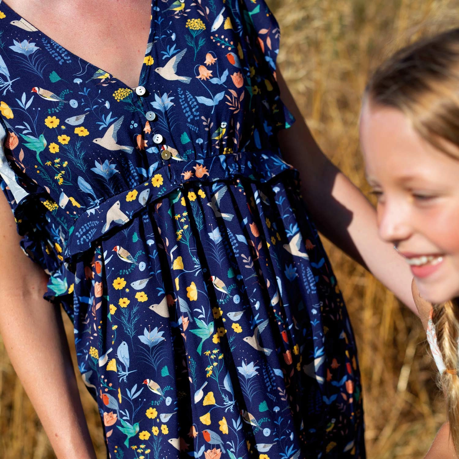 Miękka, lekka tkanina, która pięknie się układa, idealna do szycia sukienek i bluzek. Magiczny nadruk wielobarwnych kwiatów i ptaków na granatowym tle.