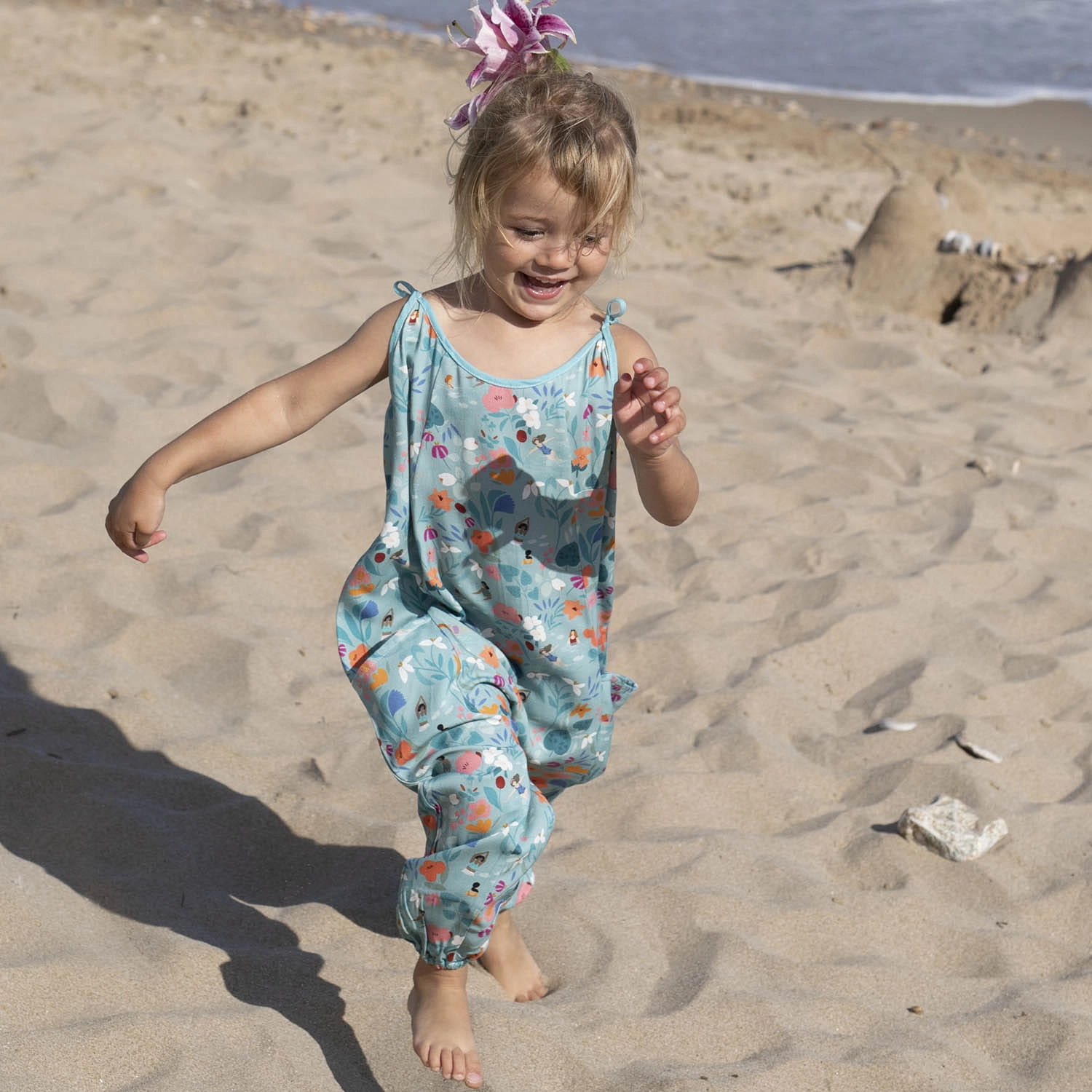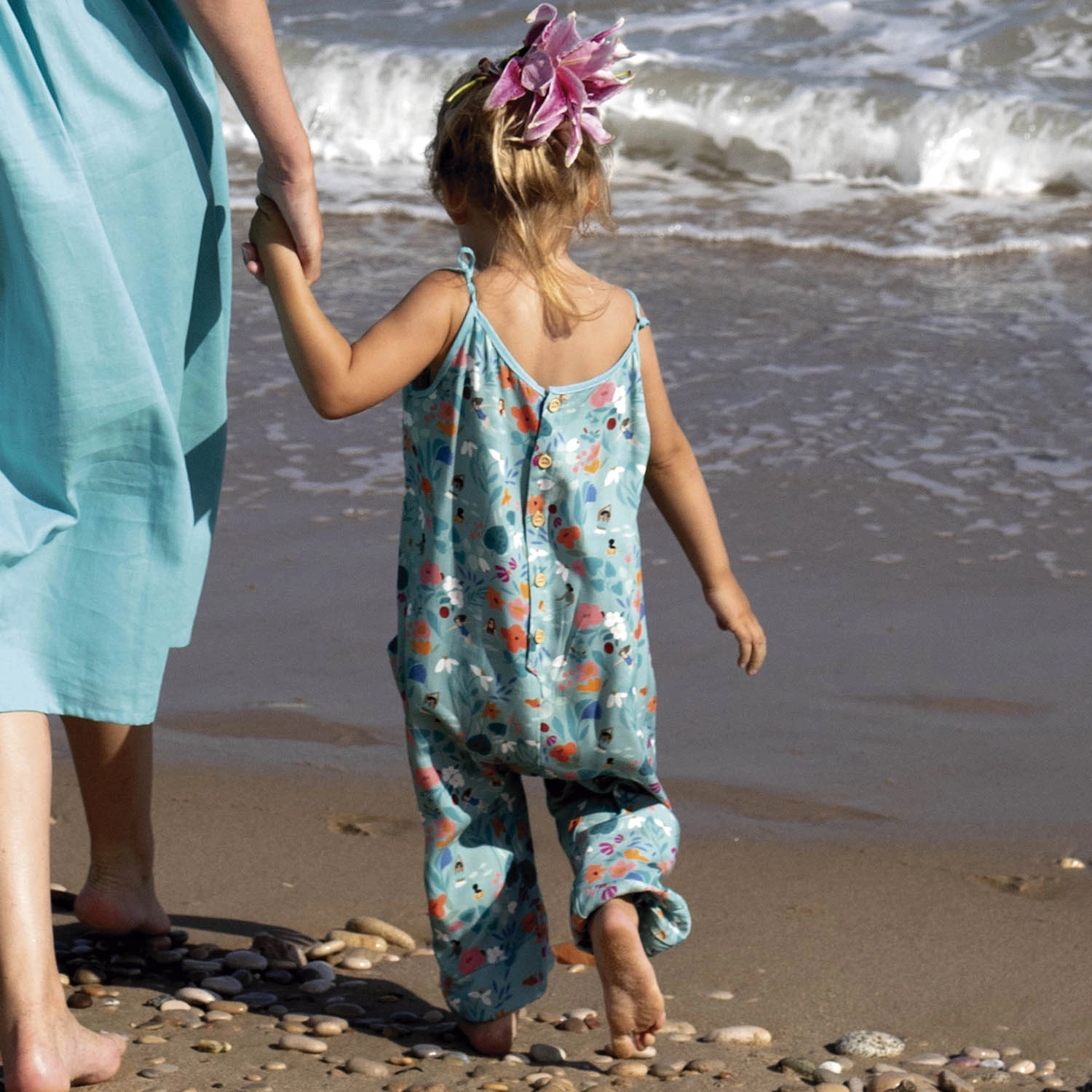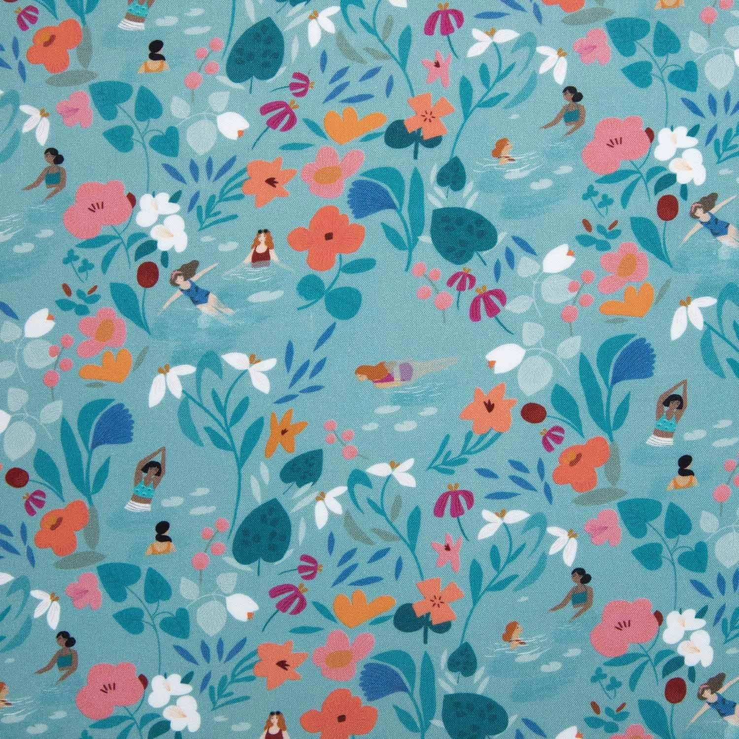 Miękka, lekka tkanina, która pięknie się układa, dzięki czemu idealnie nadaje się na sukienki i bluzki. Z nadrukiem dziewczynek kąpiących się wśród różnokolorowych kwiatów na niebiesko-zielonym tle.